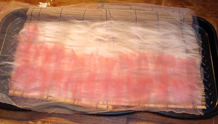The below photo shows the first two layers of wool. The second layer is at 90 degrees to the first. The wool has been laid upon a bamboo placemat ready for rolling. I actually prefer to use bubble wrap but either method works well.